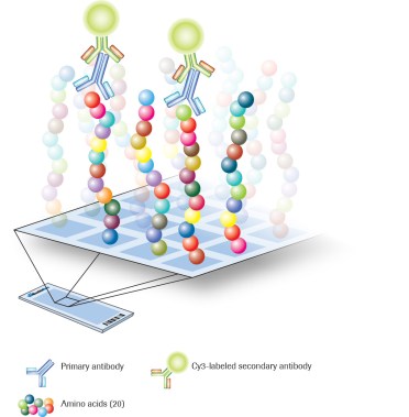 Peptides On Array Previous Next Published February 24, 2013 at 1148 × 1172 in Scientific Illustrations Peptides On Array, 2010 Descriptive drawing of the amino acids forming a peptide chain attached to a 3″ x 1″ glass slide. Created using Illustrator.
