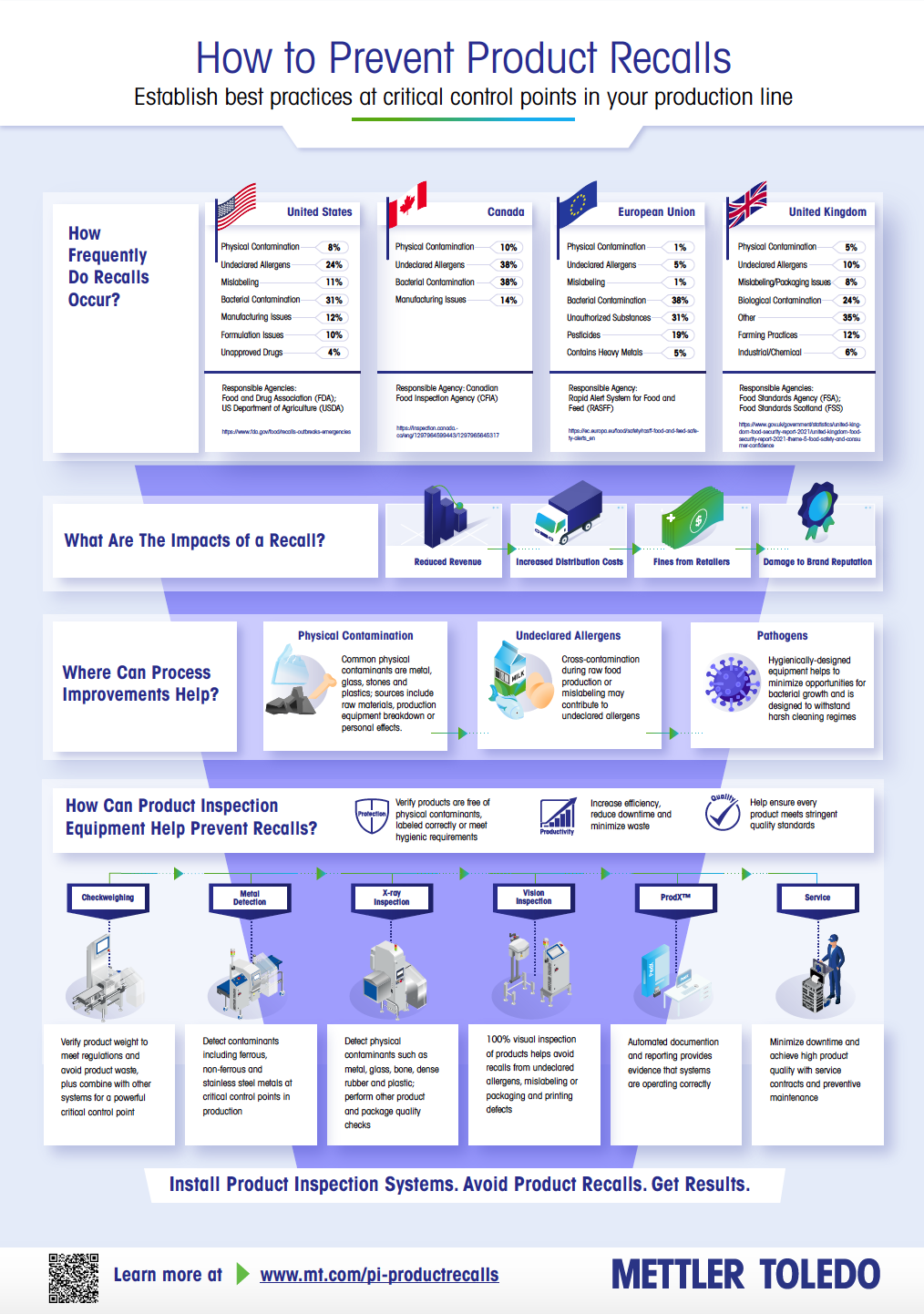 In this overview of product recalls, I took data from the US, UK, Canada and EU from 2021 and put it into an easy to follow infographic. Combing through large spreadsheets of data enabled me to categorize the information into the main buckets for the reasons for recalls: physical contaminants, biological contaminants and labeling. Understanding these factors allowed me to review how our product inspection technologies might benefit manufacturers. With this design, I worked together with an agency and internal team members to continue using the 3D isometric styling for unifomity in our brand presentation.